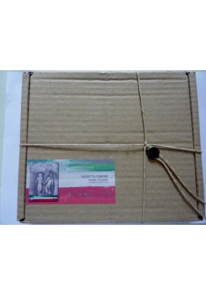 Scatola in cartone DI 17,5 x 21 cm con tavola a colori applicata al piatto e cordicella di chiusura con sigillo metallico.La scatola catalogo contiene: 14 Cartoncini con le opere esposte 1 Cartoncino realizzato dall artista in occasione della mostra, 3 Pieghevoli ( critica a cura di Ilaria Bignotti, biografie e mostre) 1 cartoncino riassuntivo . In copertina la tavola applicata "Italia" dedicata a Goffredo Parise.edizione speciale--eng