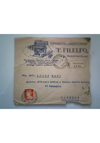 Busta Viaggiata "TIPOGRAFIA E BILGIETTIFICIO F. FILELFO TOLENTINO" 1932