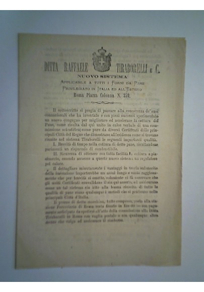 Pieghevole "DITTA RAFFAELE TIRABORELLI e C. NUOVO SISTEMA COTTURA PANE" 1871