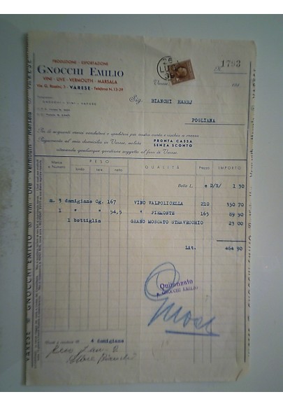 GNOCCHI EMILIO VINI - UVE - VERMOUTH - MARSALA VARESE 26 Luglio 1939