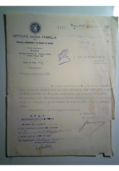 ISTITUTO SACRA FAMIGLIA PER FANCIULLI ABBANDONATI ED ORFANI DI GUERRA Roma 30 Aprile 1930 - VIII