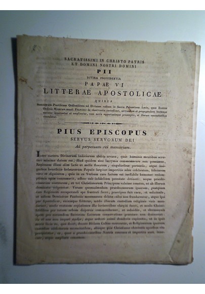 Lettera di Papa Pio VI relativa al sostegno e alla propagazione della Custodia della Terra Santa in capo ai frati francescani