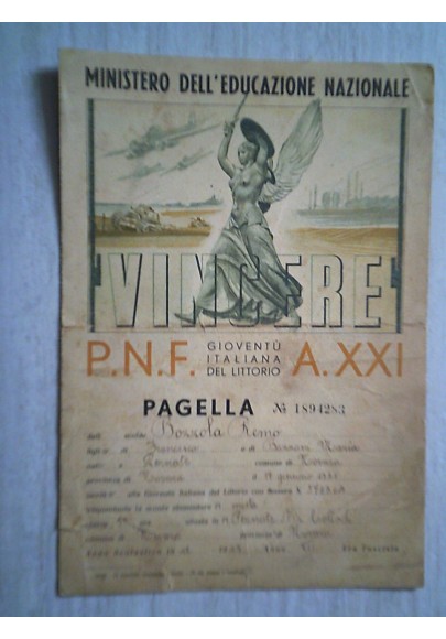 P.N.F. MINISTERO DELL' EDUCAZIONE NAZIONALE A. XX PAGELLA 1943