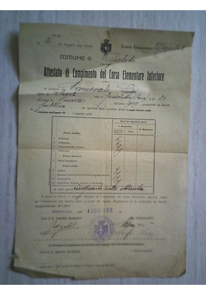 Attestato di Compimento del Corso Elementare Inferiore VESPOLATE 1920