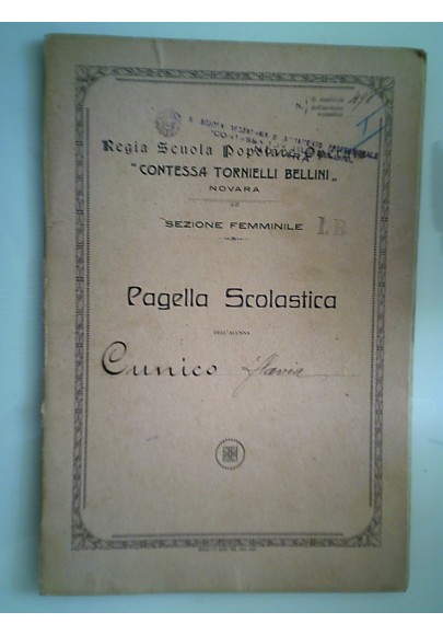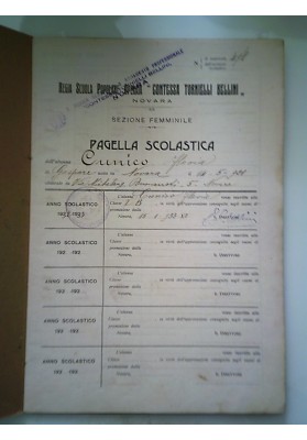 Regia Scuola Popolare "CONTESSA TORNIELLI BELLINI" NOVARA SEZIONE FEMMINILE PAGELLA SCOLASTICA