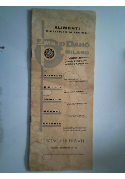 Formato in 8° stretto; 15 pagine. Brossura editoriale spillata: macchie. Listino con relativi prezzi delle specialità dietetiche della Ditta "EMILIO DAHO'" di Milano.