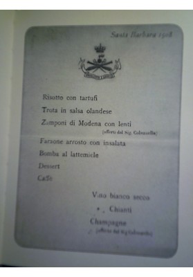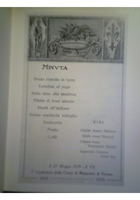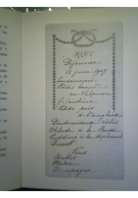 Formato in 16°; 230 pagine. Legatura cartonata figurata. Interno fresco. Con facsimili di menu' d'epoca. Edizione fuori commercio per l'A.I.R.C.