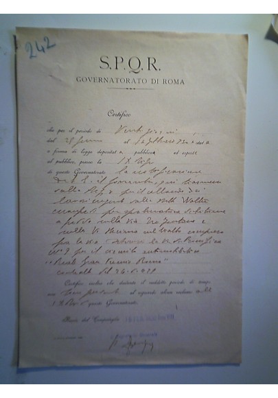 S.P.Q.R. GOVERNATORATO DI ROMA CERTIFICATO 16 Febbraio 1930 Anno VIII