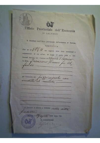 Uffiicio Provincialre dell'Economia SALERNO Certificato 29 Agosto 1929 Anno VIII