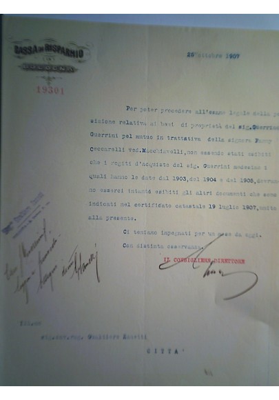 Lettera "CASSA DI RISPARMIO DI BOLOGNA 25 Ottobre 1907"
