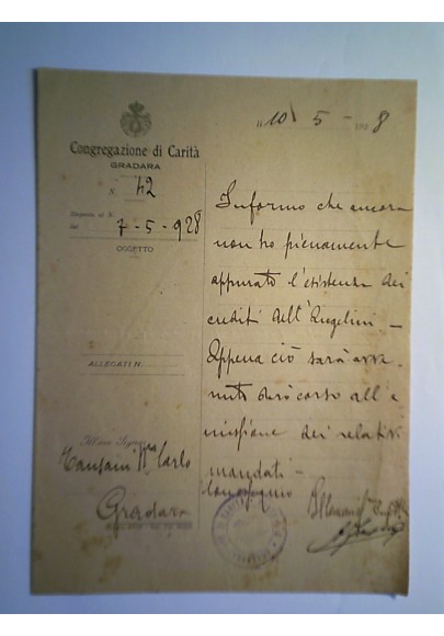 Lettera "CONGREGAZIONE DI CARITA' DI GRADARA 10 Maggio 1928"