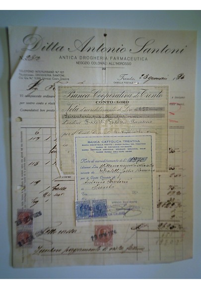 Fattura Ditta Antonio Santoni ANTICA DROGHERIA FARMACEUTICA Trento 28 Gennaio 1926