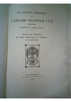 Formato in 4°; 68 pagine. Brossura editoriale: taloncino di biblioteca dismessa alla copertina anteriore. Copia in barbe. Ritratto di P. Girolamo Gulbovich in antiporta protetto da velina.