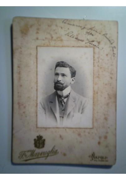 Fotografia in nero montata su cartoncino. Ritratto maschile. Con dedica manoscritta. Dimensioni complessive: 16 x 11 cm.
