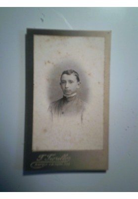 Fotografia in nero montatata su cartoncino. Ritratto di ragazzo. Retrocon note manoscritte e pubblicità del fotografo.
